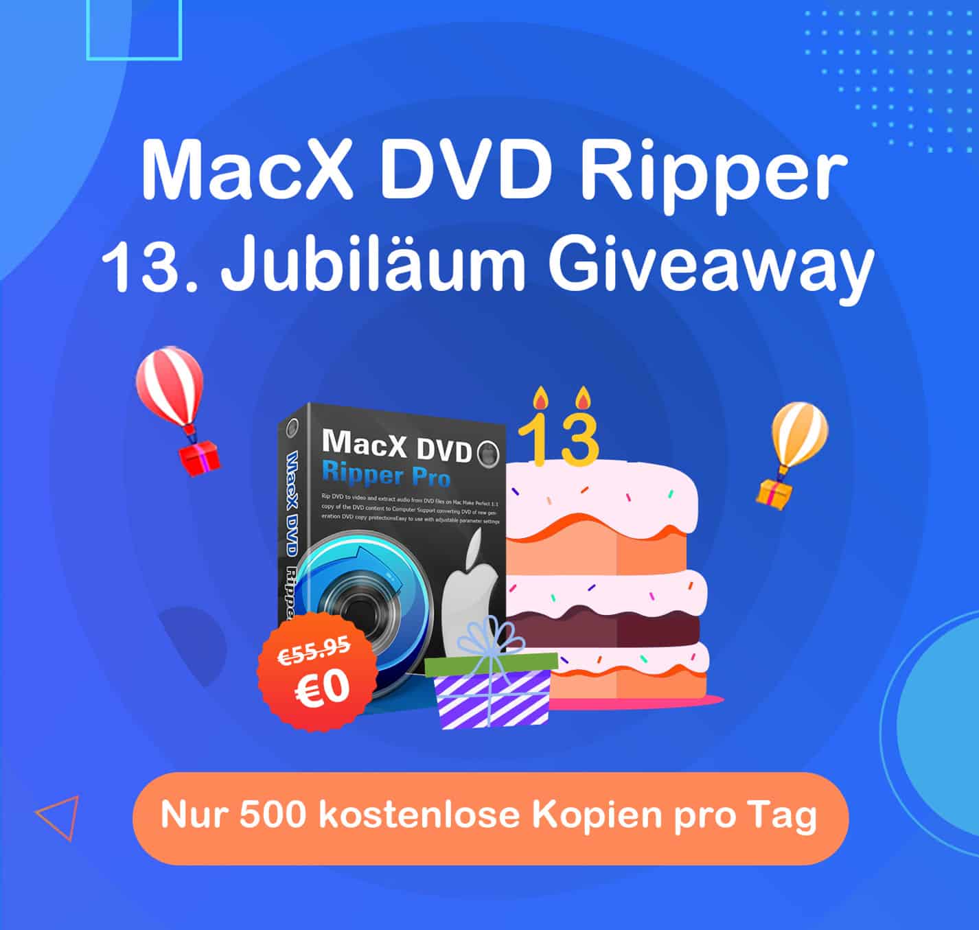 Anzeige. Das Unternehmen MacX DVD feiert das 13. Jubiläum mit Geschenken und Rabatten. Pro Tag werden 500 Kopien des Programms MacX DVD Ripper Pro verschenkt – bis zum 5. Juni 2023. Auf der Sonderseite ist ein Zähler vorhanden, über die Eingabe eurer E-Mailadresse gelangt ihr an eine kostenlose Kopie der aktuellen Version. Für zukünftige Updates ist diese Version aber nicht berechtigt.