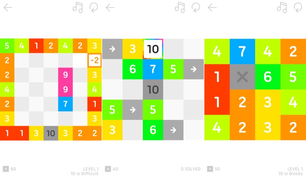 Als beendet gilt ein Level erst, wenn alle Blöcke vom Spielfeld verschwunden sind. Neben der 10, die automatisch eingefroren wird, gilt hier nur noch die 0 als Ausnahme. Die kann man in späteren Level erreichen, weil auch negative Zahlen auftauchen. Spannend wird es auch, wenn die zahlreichen Bonus-Blöcke ins Spiel kommen: In 10 gibt es unter anderem Multiplikatoren oder Blöcke, die man nur in eine bestimmte Richtung verschieben kann.