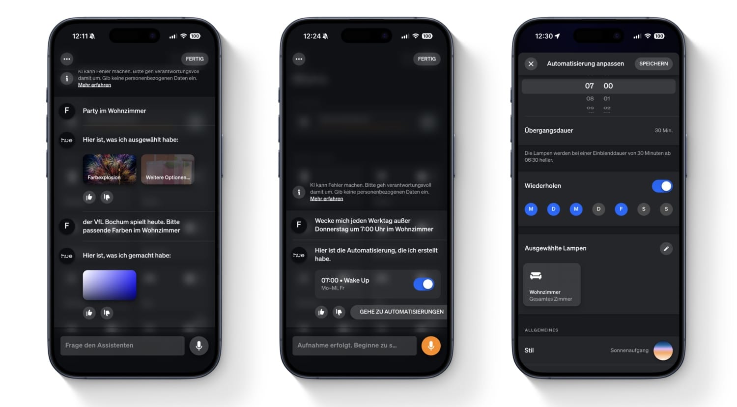 Darüber hinaus – und hier spart man tatsächlich ordentlich Zeit – kann der Hue KI Assistant auch Automationen erstellen. „Wecke mich jeden Werktag außer Donnerstag um 7:00 Uhr im Wohnzimmer“ erstellt ohne Probleme die passende Wake-Up-Automation mit der passenden Sonnenaufgangs-Szene im gewünschten Raum.