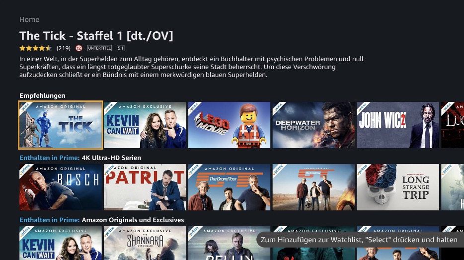 - Fügen Sie Ihrer Watchlist Titel hinzu, um diese später über Amazon Prime Video-kompatible Geräte anzusehen.