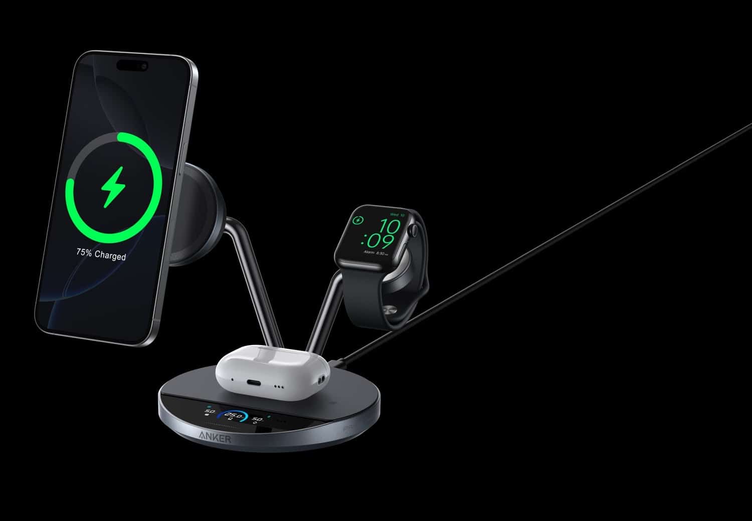 Mit der Anker Prime Kabellose Ladestation (3-in-1 Ständer) lassen sich das iPhone, die Apple Watch und Kopfhörer gleichzeitig laden. Die Station ist in einem 70 Grad verstellbaren Winkel einsetzbar und bietet kabelloses Laden nach dem neuesten Qi-2.2-Standard mit bis zu 25 Watt sowie zwei weitere 5-Watt-Ladepunkte für Uhr und Kopfhörer. Eine integrierte Kühlung hält die Temperatur der Geräte konstant unter 36 Grad Celsius und verlängert so deren Lebensdauer. Das integrierte Display informiert in Echtzeit über den Ladefortschritt und lässt sich per Doppeltipp steuern. Ab dem 25. September gibt es die Station bei Anker, Amazon und im Handel.