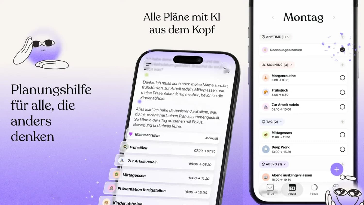 Tiimo ist eine minimalistisch, aber sehr ansprechend gestaltetet Tagesplaner-App, die euch KI-gestützt dabei helfen will, eure Tage und Aufgaben besser zu managen. Dafür synchronisiert die App alle Kalendereinträge und Erinnerungen, die ihr in den jeweiligen Apps gespeichert habt.