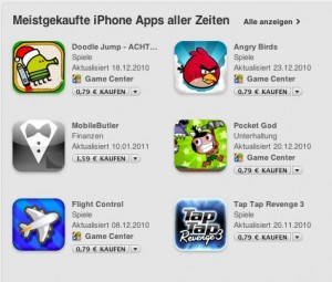 Apple hat im Rahmen seiner Countdown-Aktion die meistgeladenen Apps der verschiedenen Länder-Stores bekannt gegeben. Im deutschen Store dominieren die 79-Cent-Apps die Top-10, allen voran natürlich Doodle Jump und Angry Birds, die beiden beliebtesten Spiele. Auch Flight Control und Tap Tap Revenge landeten weit vorne, wobei letzteres mittlerweile stark abgesackt zu sein scheint.