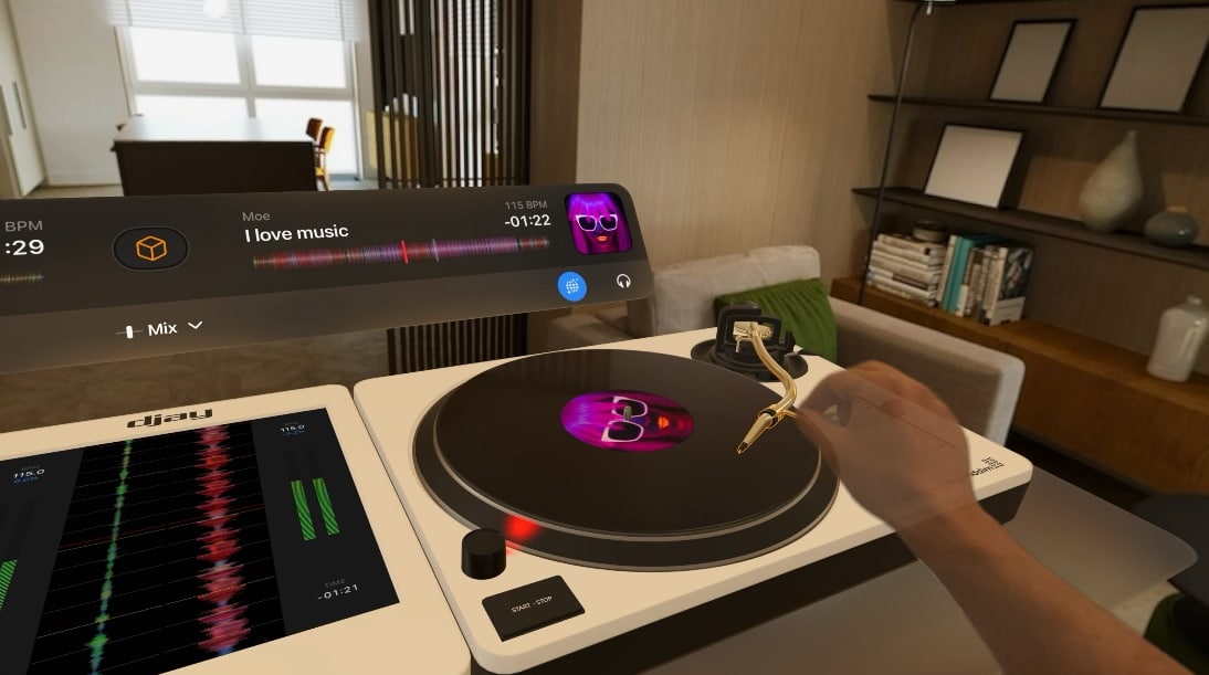 Die DJ-App „djay“ bietet eine optimierte Version für die Apple Vision Pro an, mit der ihr im virtuellen Raum Songs abmischen könnt. Das sieht wirklich wild aus und setzt natürlich eine Apple Vision Pro voraus. Weiterhin ist djay auch für iPhone, iPad und Mac erhältlich und ist eine renommierte DJ-Software, die schon in den vergangenen Jahre mehrerer Apple Design Awards gewonnen hat.