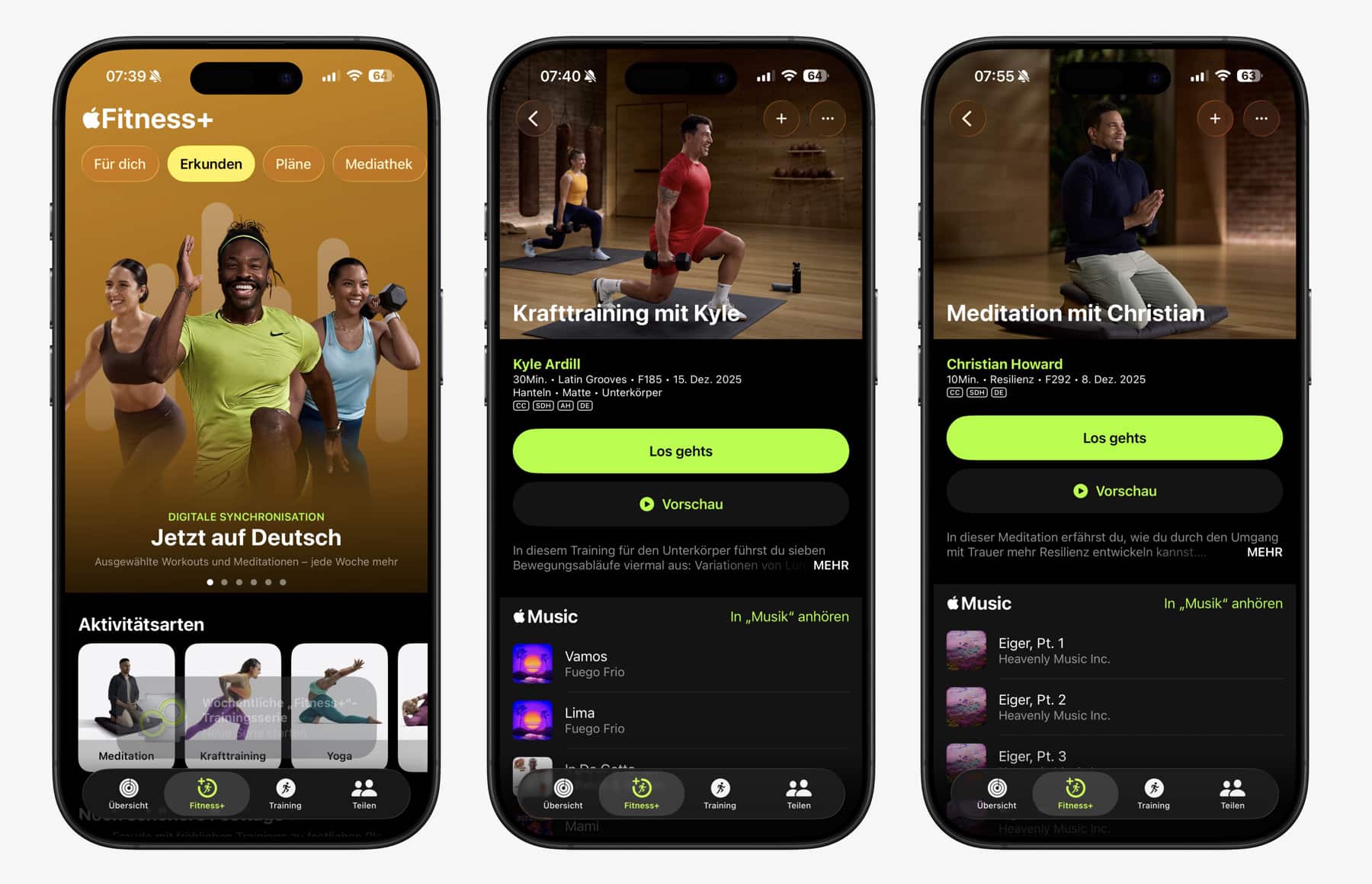 Apple Fitness+ ist, wie angekündigt, ab sofort in deutscher Sprache verfügbar. Allerdings hat Apple ausschließlich deutsche Stimmen eingeführt. Das bedeutet, dass es keine Trainings mit deutschen Trainerinnen und Trainern gibt, sondern die Originalaufnahmen mit einer computergenerierten Stimme auf Deutsch erweitert werden.