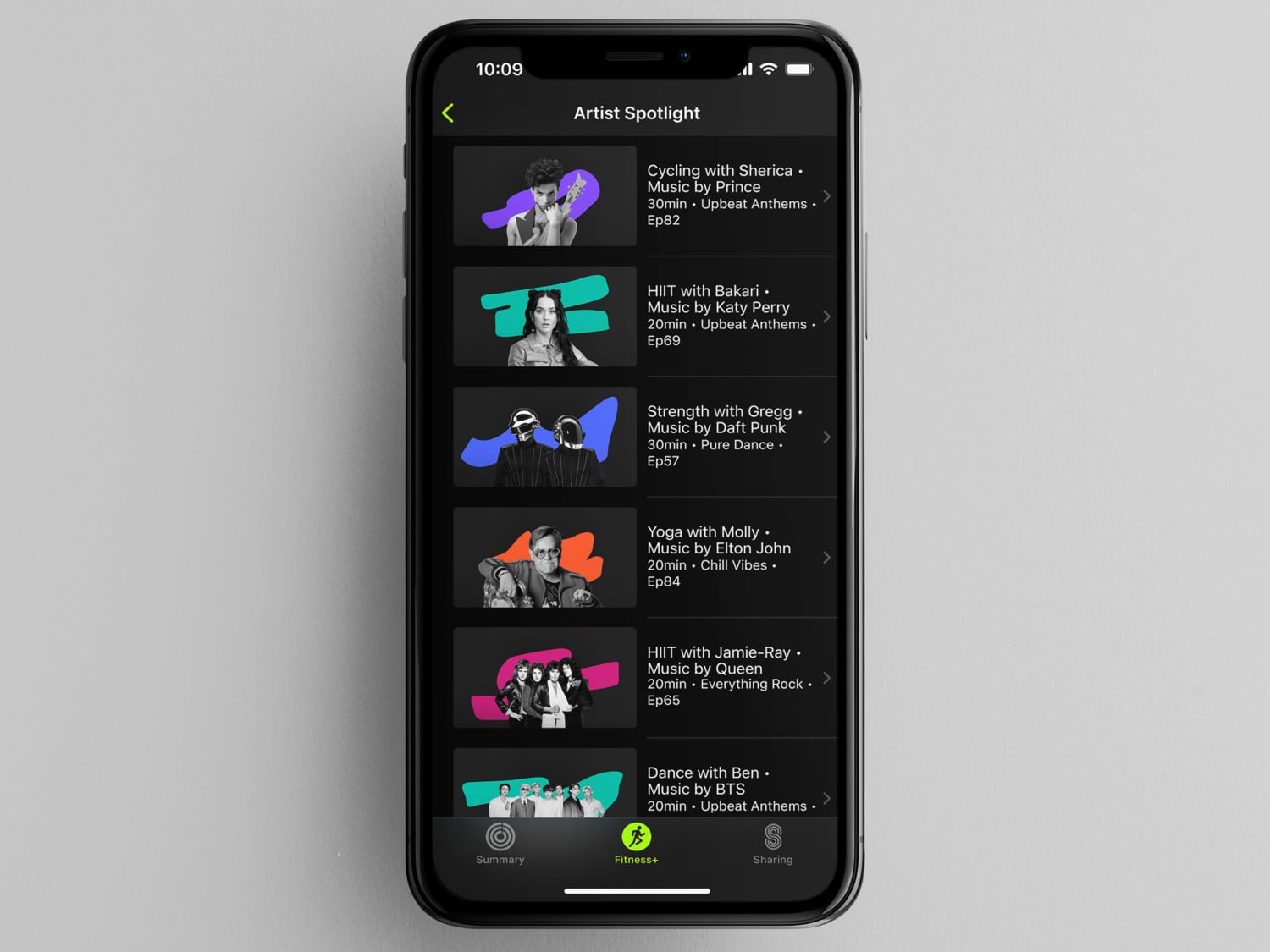 Die Artist Spotlight-Serie bietet über 50 Workouts für fast jede Trainingsart mit der Musik von Künstlern und Künstlerinnen wie BTS, Queen, Nicki Minaj, The Beatles, Shakira, Calvin Harris, Keith Urban, Lady Gaga, Alicia Keys und Jennifer Lopez und vielen weiteren. Elton John hat sich zu seiner Kooperation mit Apple Fitness+ geäußert:
