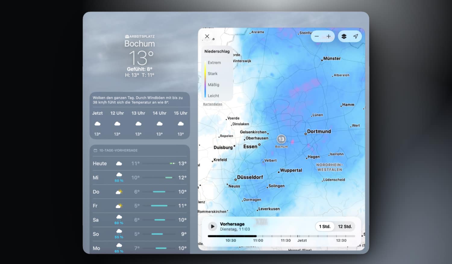 Die auf jedem iPhone vorinstallierte Wetter-App von Apple hat im Verlauf der letzten Jahre auch Einzug auf das iPad und den Mac gehalten und lässt sich überraschend gut für Wetterprognosen der nächsten Tage verwenden. Nun gibt es auch in Deutschland eine Funktion, auf die wir bisher lange verzichten mussten: Minutengenaue Radar-Vorhersagen.
