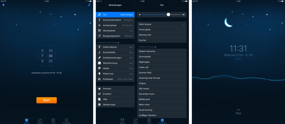 Sleep Cycle: Diese App ist nach eigener Aussage der Entwickler von Northcube „ein intelligenter Wecker, der Ihren Schlaf analysiert und Sie in Ihrer leichtesten Schlafphase aufweckt – die natürliche Art aufzuwachen und sich ausgeruht und relaxed zu fühlen.“ Die Anwendung nutzt dabei das Mikrofon und den Beschleunigungssensor des iDevices, das mit angeschlossenem Ladekabel direkt neben dem Bett liegen muss, um Schlafdaten aufzuzeichnen und auszuwerten. Neben verschiedenen Weckertönen und benutzerdefinierten Aufwachzeiträumen gibt es auch detaillierte Schlafstatistiken und -tabellen, eine Schlummerfunktion und eine Möglichkeit, die Schlafdaten zu Excel exportieren zu können.