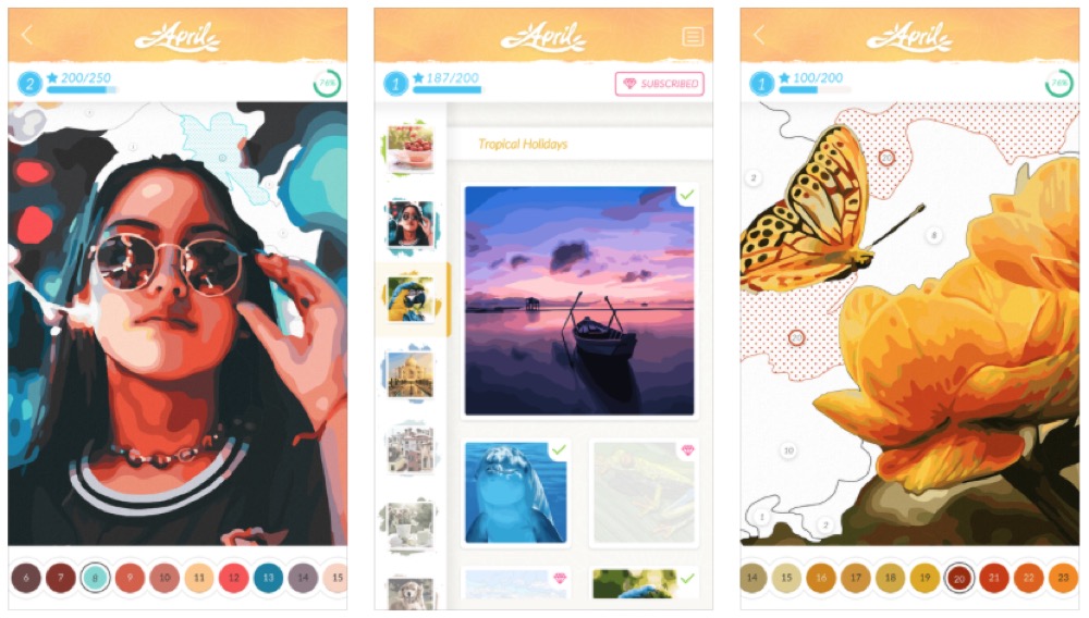 Das berühmte „Malen nach Zahlen“-Prinzip, bei dem einer spezifischen Farbe eine Zahl zugeordnet wird und so ein Bild mit entsprechenden Zahlenfeldern ausgemalt werden will, findet sich auch in April. Laut Angaben der Entwickler stehen dazu mehrere hundert Vorlagen bereit, die sich vom neuen Nutzer ausmalen lassen. Wer jedoch gleich auf alle Motive Zugriff haben möchte, ist auf ein kostenpflichtiges Premium-Abo angewiesen, das zum Preis von 9,99 USD/Monat in der App abgeschlossen werden kann. Gleichzeitig erhält man damit auch Werbefreiheit und bald die Möglichkeit, fertig gemalte Bilder als druckbare PDFs zu exportieren.