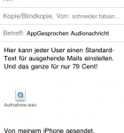 Besonders ärgerlich: AppGesprochen erlaubt immer nur eine Aufnahme. Drückt man ein zweites Mal auf den Record-Button, wird die erste Aufnahme überschrieben und kann nicht mehr per Mail versendet werden. Ein weiteres Manko: der Play-Button ist nach der Aktivierung nicht gesperrt. Man kann ihn immer wieder anklicken und einen regelrechten Kanon erzeugen – aber nicht stoppen.