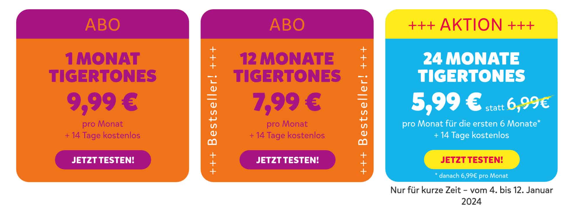 1 Monat Tigertones kostet normalerweise 9,99 Euro/Monat, im Jahresabo sind es nur noch 7,99 Euro pro Monat. Bis zum 12. Januar 2024 gibt es ein Aktionsangebot, bei dem ihr euch zwar für eine lange Laufzeit entscheiden müsst, dafür aber auch ordentlich spart. In den ersten 6 Monaten bezahlt ihr nur 5,99 Euro, danach 6,99 Euro. Ihr bindet euch für insgesamt 24 Monate.