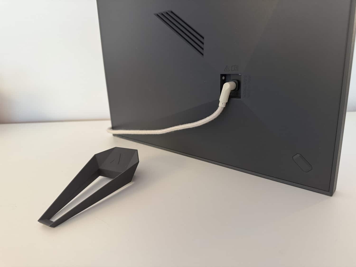 Aufstellen kann man den Aura Aspen übrigens im Quer- oder Hochformat. Der auf der Rückseite befindliche Ständer aus Metall kann dafür einfach abgenommen und gedreht werden. Das Bildverhältnis beträgt dabe 4:3, perfekt für mit dem Smartphone aufgenommene Bilder. Was die Hardware angeht, hätte ich nur ein Detail anders gelöst: Statt des Stromkabels mit einem eigenen Anschluss hätte ich USB-C zur Stromversorgung bevorzugt. Damit wäre man noch etwas flexibler unterwegs.