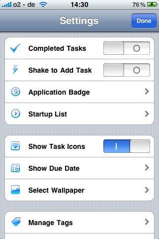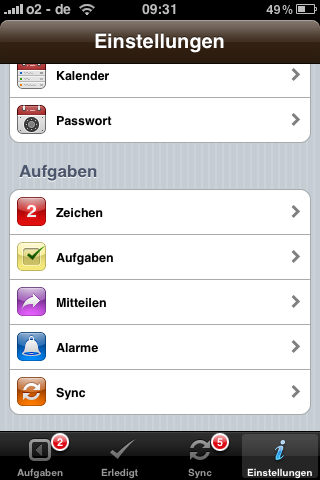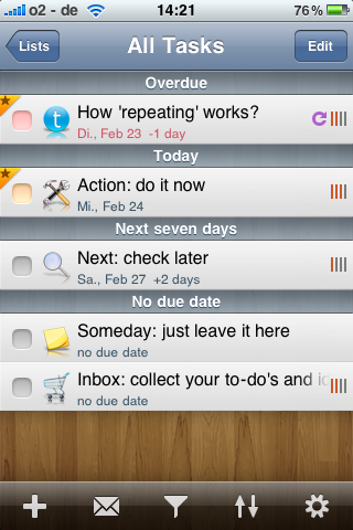 Wie es sich für eine gute Todo-App gehört ist eine Synchronisationsmöglichkeit direkt eingebaut. Entweder nutzt man den beliebten Onlinedienst Toodledo oder gleicht seine Aufgaben per Wifi mit dem eigenen PC oder Mac ab – wofür allerdings ein kleines kostenloses Tool auf dem Rechner installiert werden muss.