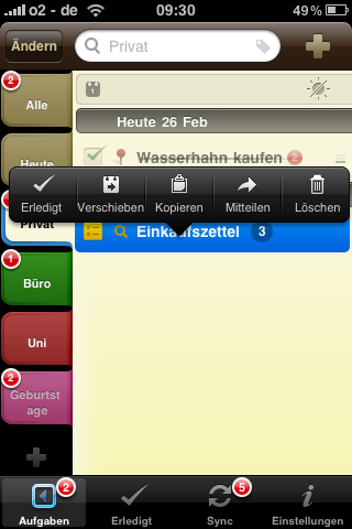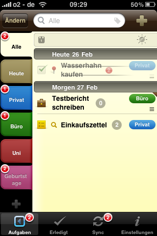 Trotz seiner vielen Optionen und Einstellmöglichkeiten macht 2Do einen sehr aufgeräumten Eindruck. Auf dem Startbildschirm bekommt man gleich eine Liste seiner aktuellen Aufgaben geboten, die ordentlich in verschiedene Reiter wie heute, morgen und den verschiedenen Kategorien eingeordnet sind.