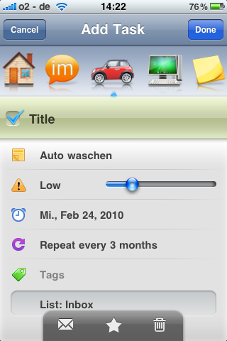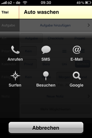 Mit einem Klick auf das „+“ am rechten oberen Bildschirmrand richtet man spielend einfach eine neue Aufgabe ein. Neben gewohnten Eingabefelder wie Titel, Priorität und dem Fälligkeitsdatum hat uns vor allem die Option Aufgabe beeindruckt. Hier kann nicht nur ein Kontakt aus dem Adressbuch eingegeben werden, sondern auch ein Suchbegriff für Google oder die aktuellen GPS-Koordinaten.
