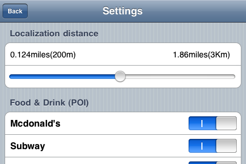 Hält man das iPhone horizontal, also mit dem Display in Richtung Himmel, wird zunächst eine Liste aller POIs angezeigt. Der gewünschte Umgebungsradius kann dabei in den Optionen frei zwischen 200 Metern und drei Kilometern eingestellt werden. Wählt man einen Punkt aus der Liste aus, wird die Richtung zum Ziel und die verbleibende Distanz durch einen frei rotierenden Pfeil angezeigt. Leider werden die Entfernungsdaten nicht in Echtzeit, sondern nur in Intervallen aktualisiert.