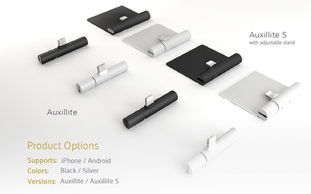 Der an die Form einer kleinen Röhre erinnernde Auxillite-Adapter verfügt über einen mittigen Lightning-Anschluss, der an das iPhone eingesteckt wird, sowie an beiden Seiten jeweils über einen Lightning- und einen 3,5 mm-Klinken-Port. Auf diese Weise kann das iPhone gleichzeitig geladen werden, während man über den Klinkenport einen kabelgebundenen Kopfhörer anschließen und Musik genießen kann. Neben dem kleinen Auxillite gibt es darüber hinaus noch ein etwas größeres Modell, den Auxillite S, der über einen integrierten verstellbaren iPhone-Ständer verfügt.