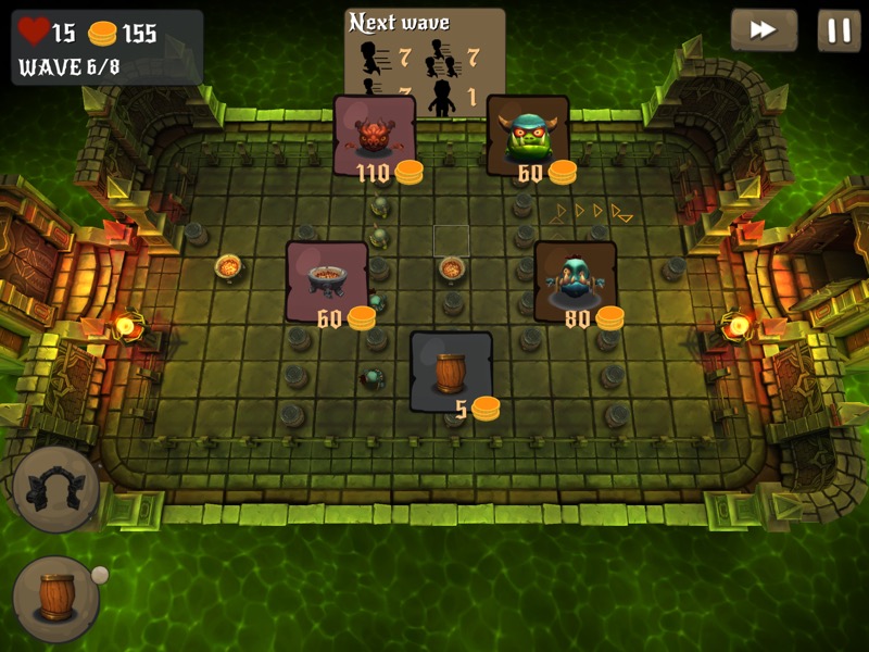 Das Besondere an Beast Towers ist nicht nur die Möglichkeit, die eigene Mannschaft von verteidigenden Monstern nach und nach durch Erfolge aufzurüsten, sondern auch das jeweilige Spielfeld mehr oder weniger frei zu gestalten. Das einzige Ziel ist in den zahlreichen Wellen eines Levels lediglich, die einfallenden Horden von Menschen (ja, Menschen! In Beast Towers steht man auf der Seite der Monster) davon abzuhalten, den Kerker zu durchqueren. Wie dies geschieht, kann der Gamer selbst entscheiden und durch Fässer Hindernis-Parcours aufbauen, durch die sich die Feinde hindurch begeben müssen – und damit umso länger anfällig für Angriffe sind.