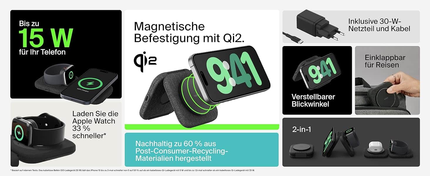 Für den gleichen Preis von 129,99 Euro bekommt ihr eine Belkin BoostCharge Pro 2-in-1-Reiseladestation. Diese ist, zumindest was die ersten beiden Elemente angeht, ähnlich gestaltet wie das bereits vorgestellte Modell. Weggefallen ist der ohnehin nur „labberig“ befestigte Teil für die AirPods, welche aber problemlos auf der Qi2-Ladefläche für das iPhone geladen werden können. Dazu gibt es einen ausklappbaren Ladepuck für die Apple Watch.