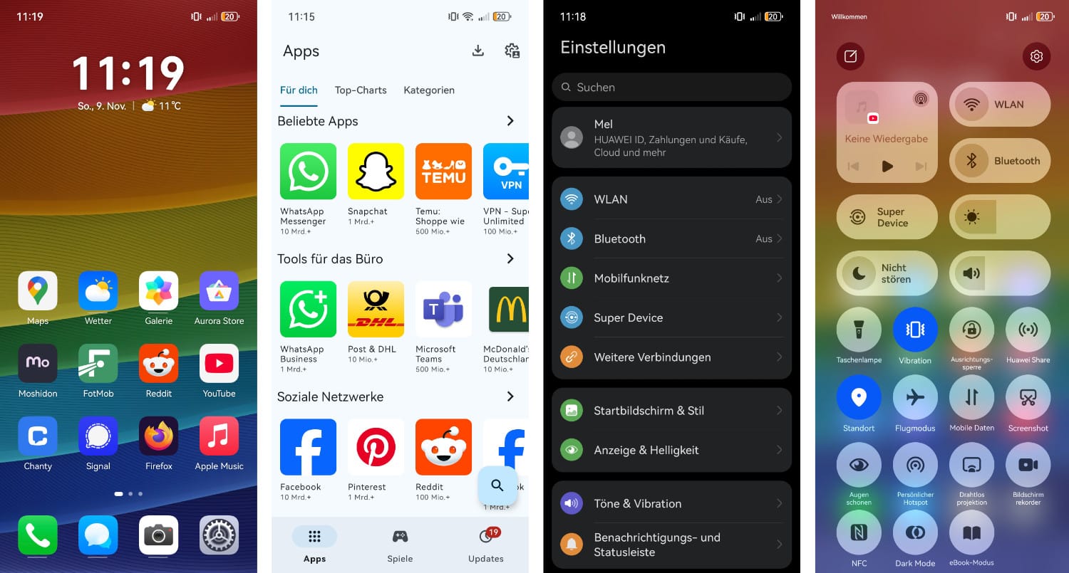Nach dem Einrichten, das bei dem Modell mit rund 15 Minuten – ohne Downloads externer Apps aus dem Store – dauerte, kann das Display des Pura 80 Pro definitiv überzeugen. Die Farben sind strahlend, aber nicht zu unnatürlich dargestellt, der Kontrast kann sich sehen lassen und liefert schöne Schwarzwerte besonders im Dark Mode des Smartphones, und der automatische Helligkeitssensor reguliert die Maximalhelligkeit des Displays akkurat und zur Situation passend. Auch Ruckler beim Scrollen oder verwischte Bewegungen traten bei mir im Alltag mit dem Pura 80 Pro nicht auf – ein echter Pluspunkt also.