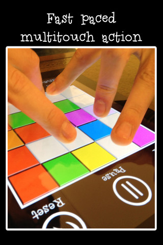 Insgesamt bietet Blox (App Store-Link) drei verschiedene Spielmodi – Fingersalat ist hier garantiert. Das Display teilt sich in farbige Quadrate auf, die mit einem Klick Punkte bringen. Besser ist es natürlich gleichfarbige Quadrate zu verbinden, damit die Punktzahl in die Höhe steigt. Dabei kann man alle zehn Finger benutzen, mit Wischgesten verbindet man Quadrate und zusätzlich lassen sich auch einzelne gleichfarbige Quadrate in die Kombination aufnehmen.