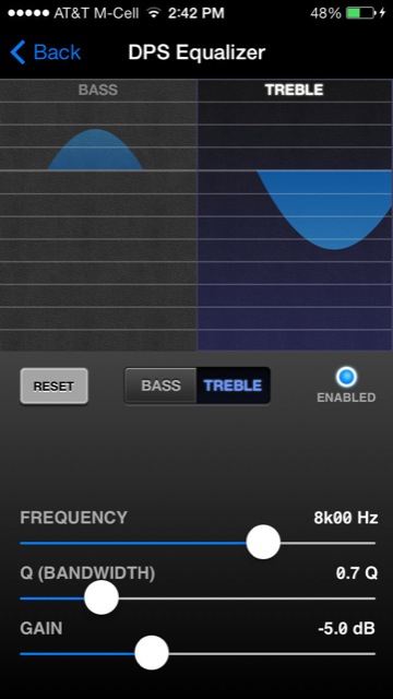 In einem app-eigenen Musikplayer lässt sich Zugriff auf die eigene Musikbibliothek erlangen – Songs in der iCloud, beispielsweise von iTunes Match-Nutzern, werden ebenfalls angezeigt. Hat man über den In-App-Kauf die Vollversion freigeschaltet, bietet sich dem Nutzer zudem eine Equalizer-Funktion, mit der die eigene Musik individuell hinsichtlich Bass und Hochtöne über Schieberegler zur Frequenz, Bandbreite und Verstärkung angepasst werden kann.