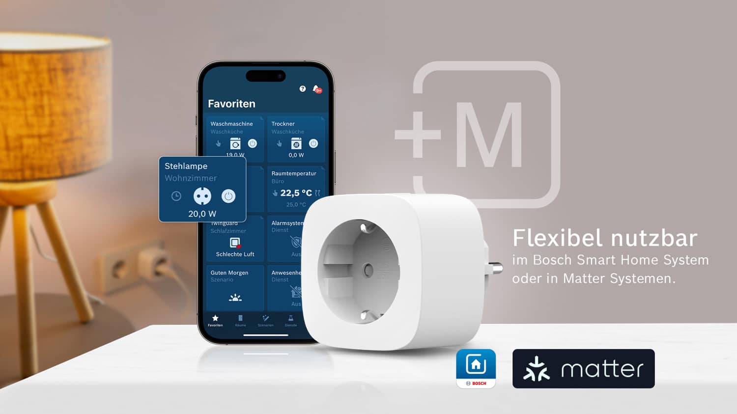 Der Bosch Smart Home Zwischenstecker kompakt [+M] macht herkömmliche Elektrogeräte smart – und damit vollständig ins Smart Home integrierbar. So lassen sich angeschlossene Geräte bequem über Automationen, Zeitpläne oder Sprachsteuerung bedienen.