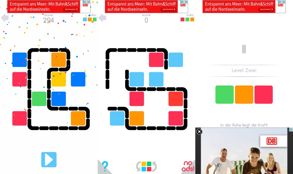Der dritte Grund dürfte dagegen ganz klar zu erkennen sein, wenn man die App heruntergeladen hat: Es wird nicht nur dauerhaft Werbung am oberen Bildschirmrand angezeigt, sondern auch ständig bildschirmfüllende Werbung eingeblendet. Diese erscheint plötzlich und ist mehr als nervig. Die Werbung kann zwar für 2,29 Euro dauerhaft deaktiviert werden, dafür überzeugt mich das Spiel aber nicht annähernd genug.