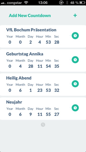 Die Bedienung von Count.do ist ebenfalls denkbar einfach. Hat man die App gestartet, klickt man ganz oben auf „Add New Countdown“ und kann dann einen neuen Namen eingeben, gefolgt von Datum und Uhrzeit. Direkt danach taucht der Punkt in der Übersicht auf und es werden verbleibende Jahre, Monate, Tage, Stunden, Minuten und Sekunden angezeigt.