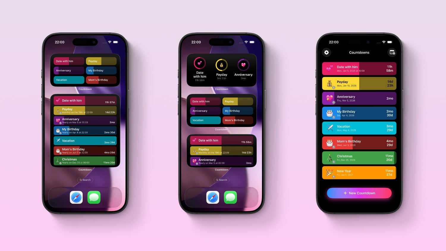 Drei iPhones, auf denen jeweils die App Countdown Widget geöffnet ist.