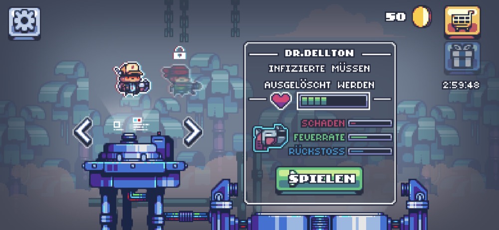 Freunde von Retro-Games und Jump’N’Runs werden daher mit Cure Hunters definitiv auf ihre Kosten kommen. Das Spiel verfügt über mehrere freischaltbare Charaktere, einige Waffen, die sich upgraden lassen, sowie jede Menge Belohnungen, Münzen, Boss Fights und einen kultigen Vintage-Soundtrack, der an gute alte Gameboy-Zeiten erinnert. Die Steuerung erfolgt über simple virtuelle Buttons auf dem Screen zum Vor- und Zurückbewegen, Schießen und Springen. Hält man den Sprung-Button länger gedrückt, ist ein weiterer bzw. höherer Satz möglich.