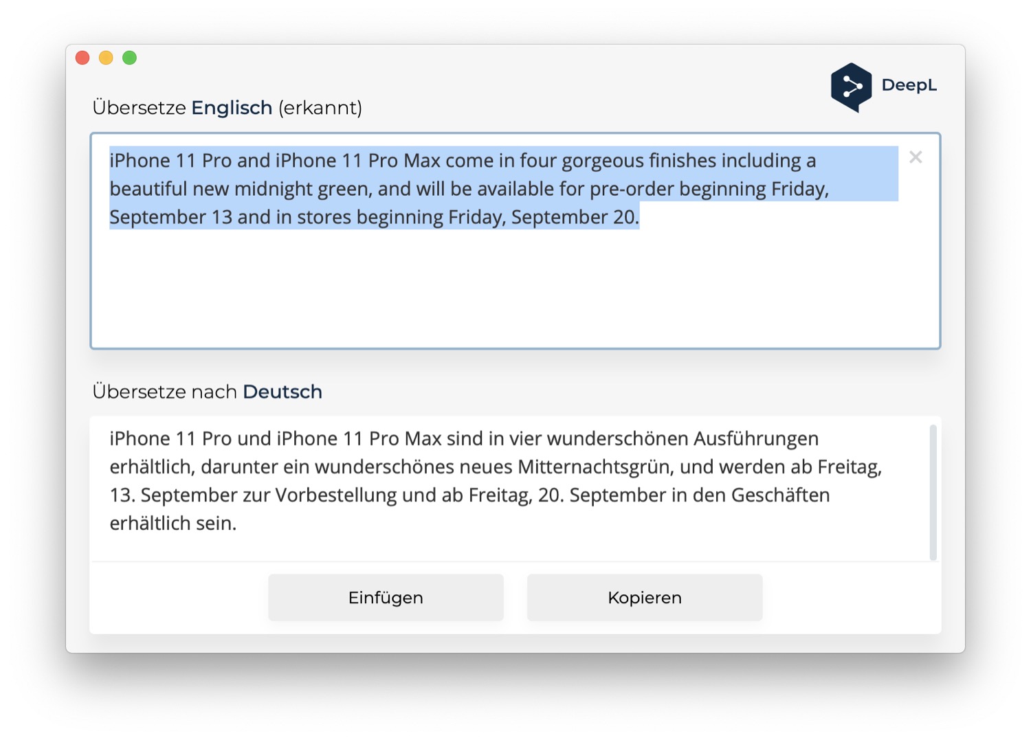 Möchte ich Text übersetzen, nutze ich stets DeepL.com, da dort dir Ergebnisse wirklich sehr, sehr gut sind. Bisher war DeepL nur im Web verfügbar und erlaubt sogar das Übersetzen von Dokumenten. Im Hausblog haben die Entwickler nun bekanntgegeben, dass eine App für Mac und Windows zum Download bereitsteht.