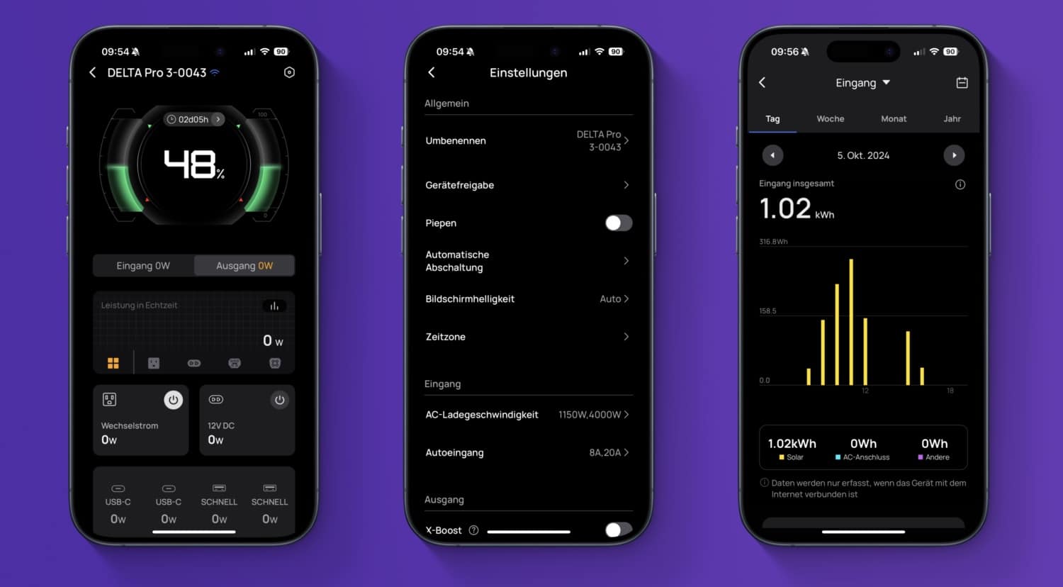 Und falls euch die 4.096 Wattstunden nicht reichen, ist das auch kein Problem. Der Speicher der Delta Pro 3 kann mit zwei Zusatz-Akkus auf bis zu 12 Kilowattstunden ausgebaut werden. Das ist dann schon wirklich sehr beeindruckend und würde schon fast dazu ausreichen, meinen Plug-in-Hybrid komplett aufzuladen. So wären, direkt aus dem Akku, rund 50 rein elektrische Auto-Kilometer möglich.
