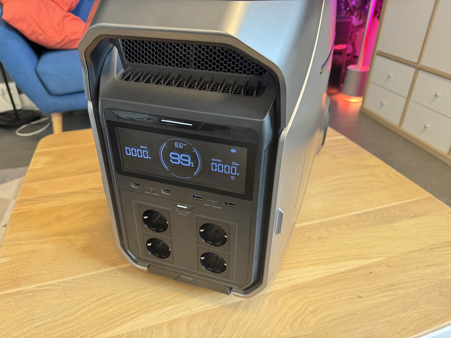 Ich habe lange überlegt, wie ich die Delta Pro 3 bei mir Zuhause nutzen kann. Ich setze sie tatsächlich als Off-Grid-Lösung ein. Die Powerstation steht unter meinem Schreibtisch und wird bisher von einem Solarmodul aufgeladen. Allerdings muss ich auch eingestehen, dass sie sich aktuell noch ein wenig langweilt.