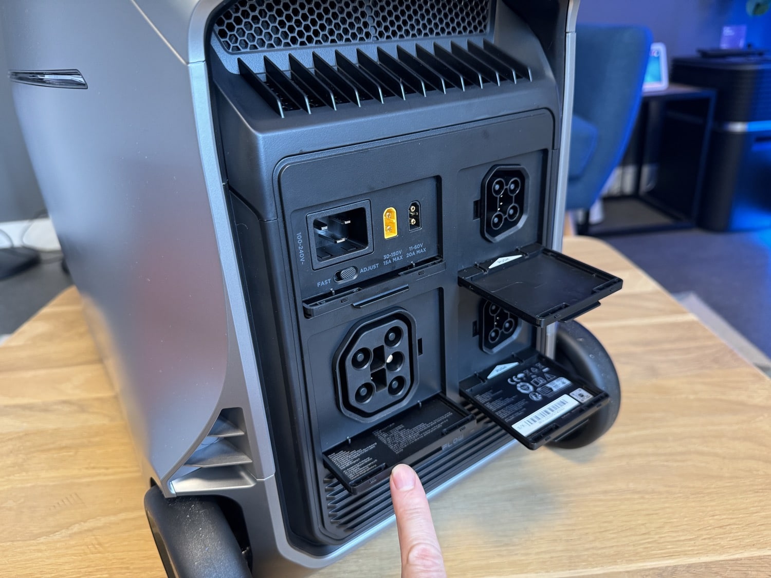 An meinem aktuellen Schreibtisch-Setup stört mich nur ein kleiner Punkt: Sämtliche Ausgänge sind auf der Vorderseite der Delta Pro 3 untergebracht. Das ist natürlich praktisch, da man sie so schnell erreichen kann. Für eine dauerhafte Lösung ist das aber vielleicht nicht ganz optimal, ich muss das Netzkabel meiner Mehrfachsteckdose um die Powerstation herum führen. Ich hätte mir zumindest einen Teil der Ausgangsanschlüsse an der Rückseite gewünscht.