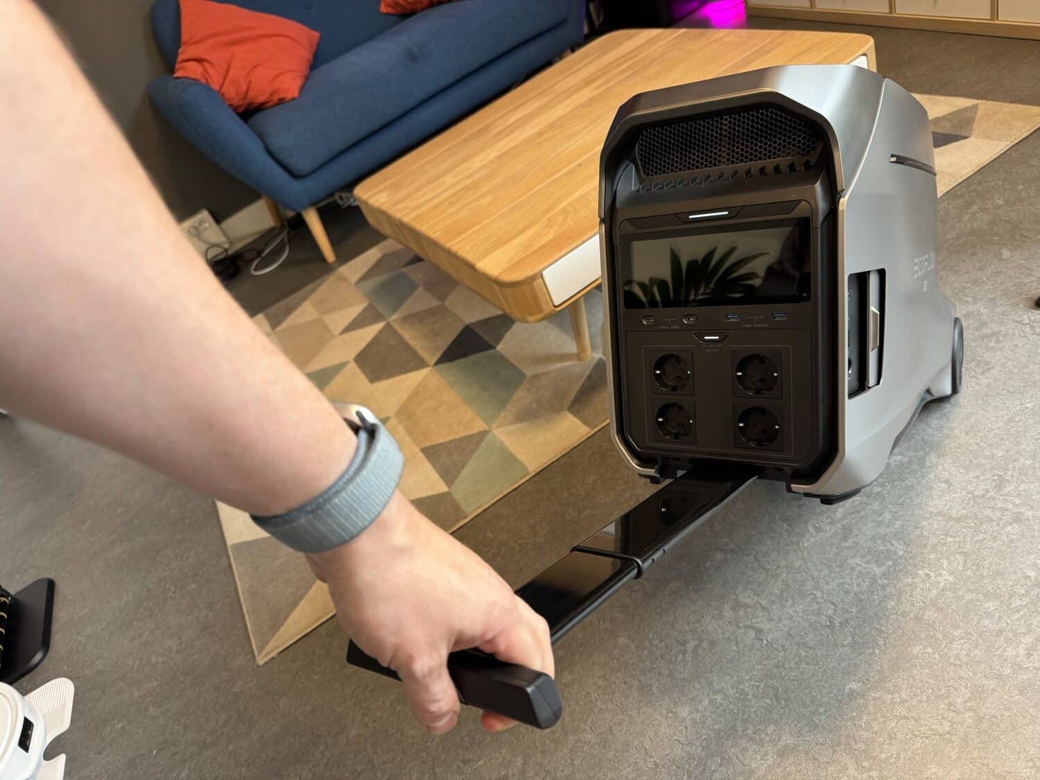 Viel bewegt werden will die Delta Pro 3 übrigens nicht, schließlich bringt sie mehr als 50 Kilogramm auf die Waage. Nicht umsonst sind Rollen und ein ausziehbarer Griff verbaut, so dass man die Powerstation wie einen Koffer ziehen kann – zumindest auf befestigtem Untergrund.