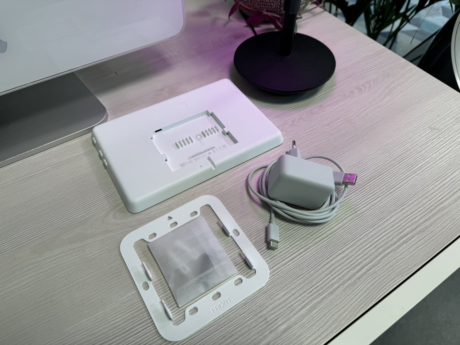 Die Befestigung an der Wand erfolgt mit Hilfe einer kleinen Wandhalterung, die Stromversorgung mit einem 180 Zentimeter langen USB-Kabel. Am Echo Hub selbst ist ein USB-C-Anschluss für die Stromversorgung zu finden, am anderen Ende des Kabels findet ihr einen USB-A-Stecker. Das mitgelieferte Netzteil hat eine Leistung von 12,5 Watt.