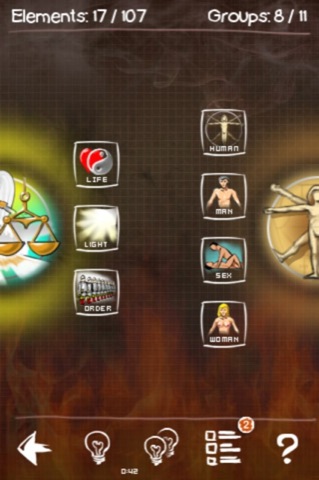 Aus verschiedenen Elementgruppen wählt man ein Element mit einem Klick aus und zieht es auf ein passendes Item. Verbindet man zum Beispiel Steine mit Feuer, so entsteht Lava. Kreuzt man Licht und Leben, so entsteht ein Engel.
