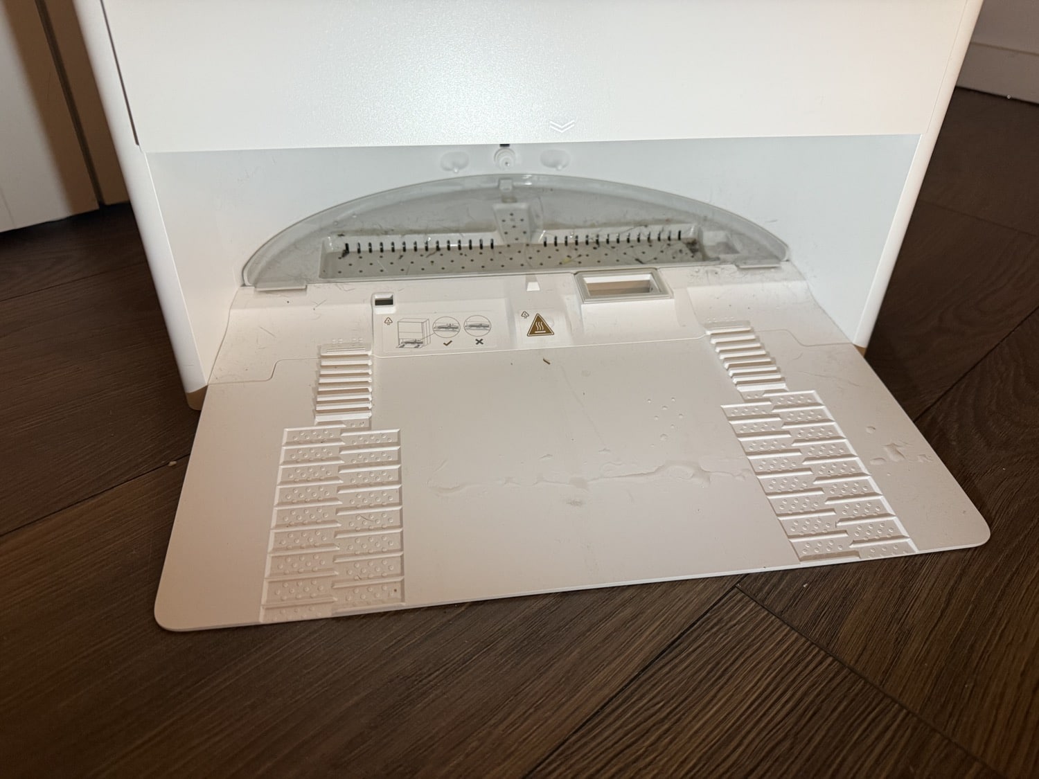 Neben der Füllung und Entleerung der Tanks bleibt als manuelle Aufgabe neben dem Austausch des Staubbeutels, der aber erst nach drei bis vier Monaten fällig wird, noch die Reinigung der Bodenplatte. Ein aktueller Blick nach 15 Reinigungszyklen zeigt dort ein paar Katzenhaare, aber noch keine wirklich groben Rückstände. Die Bodenplatte lässt sich sehr einfach herausnehmen und muss dann alle paar Wochen mal per Hand gereinigt werden.