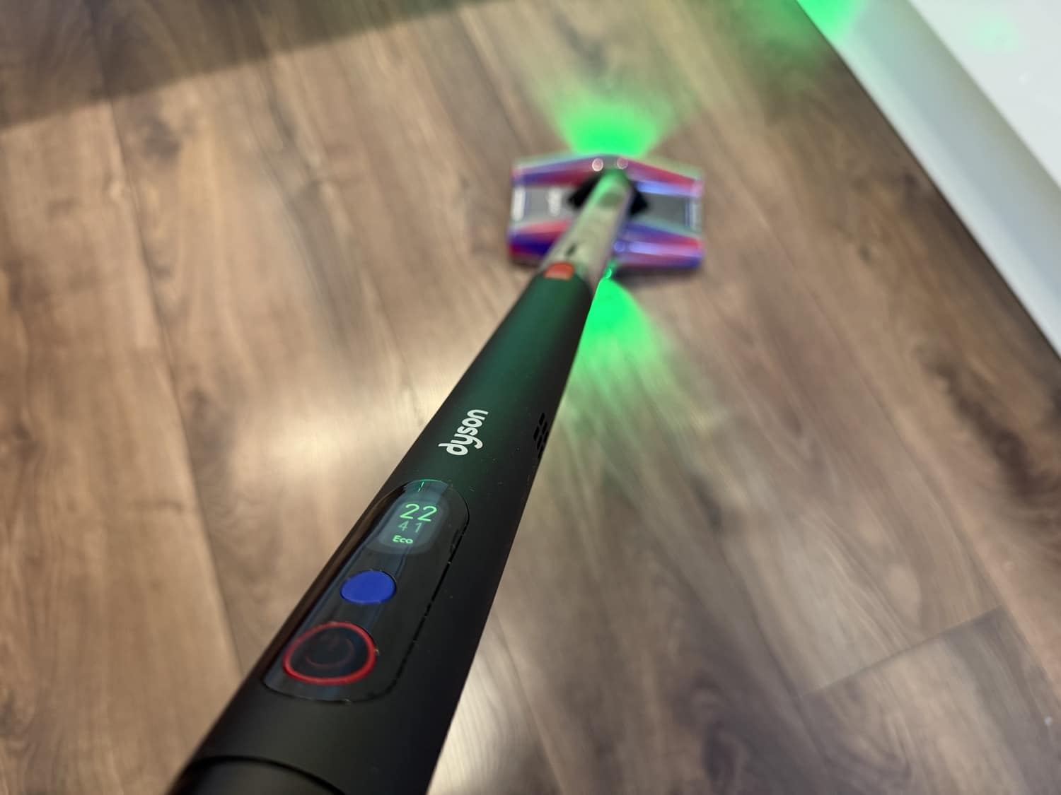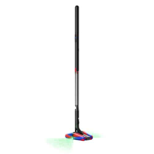 Ebenfalls bemerkenswert ist die Fluffycones-Bodendüse. Sie verfügt über vier rotierende, konische Walzen, die in entgegengesetzter Richtung rotieren. So gleitet der Dyson PencilVac förmlich über den Boden. Da sich der Stab spielend einfach um 360 Grad drehen lässt, gibt es kein Vorne und Hinten. Man kann sich quasi mit Wischbewegungen über den Hartboden arbeiten. Zwei grüne „Laser“-LEDs zeigen dabei, wo noch Schmutz und Krümel auf dem Boden liegen.