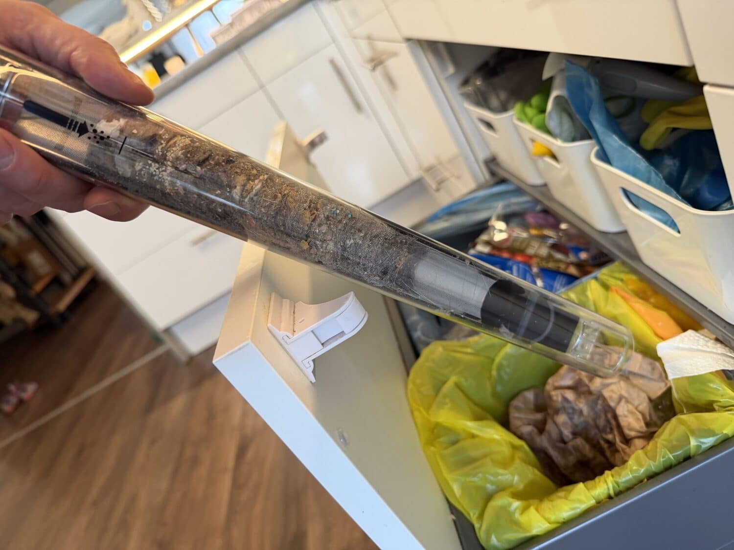 Der Dreck landet dabei in einem länglichen Staubbehälter, der in den Stab integriert wurde und natürlich über einen Filter verfügt. Natürlich hat man hier nicht das Fassungsvermögen eines ausgewachsenen Akku-Staubsaugers, zwei bis drei komplette Runden kann man mit dem Dyson PencilVac aber schon drehen. Das Entleeren ist dabei denkbar einfach und funktioniert absolut intuitiv, könnte aber etwas gründlicher sein.