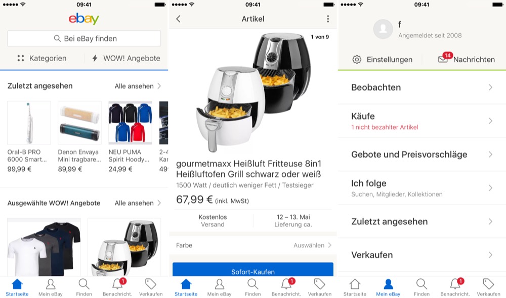Ich persönlich nutze die eBay-App eher selten, da ich meistens einen Computer zur Hand habe. Einkäufe tätige ich bei eBay sporadisch und nur dann, wenn es wirklich gute Angebote gibt. In den WOW-Deals des Tages sind ab und an ein paar interessante Deals mit dabei. Ansonsten bin ich aber ein Amazon-Käufer. Der schnelle Versand, die einfache Abwicklung und das Melden von Problemen ist bei Amazon einfach unschlagbar.