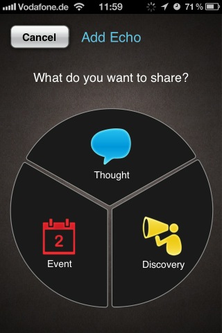 Mit Echoer (App Store-Link) ist es dem Nutzer möglich, andere User der App auf beachtenswerte Hinweise in der näheren Umgebung hinzuweisen. Dies können sowohl eigene Gedanken sein („Superleckere neue Kaffeesorte bei Starbucks“), aber auch Events („Spontanes Livekonzert!“) oder Hinweise („Große Baustelle, bitte weiträumig umfahren“). Diese Empfehlungen bzw. Mitteilungen sind farblich sortiert, so dass man gleich weiß, was einen erwartet: Gedanken sind blau, Events rot, und Hinweise gelb.