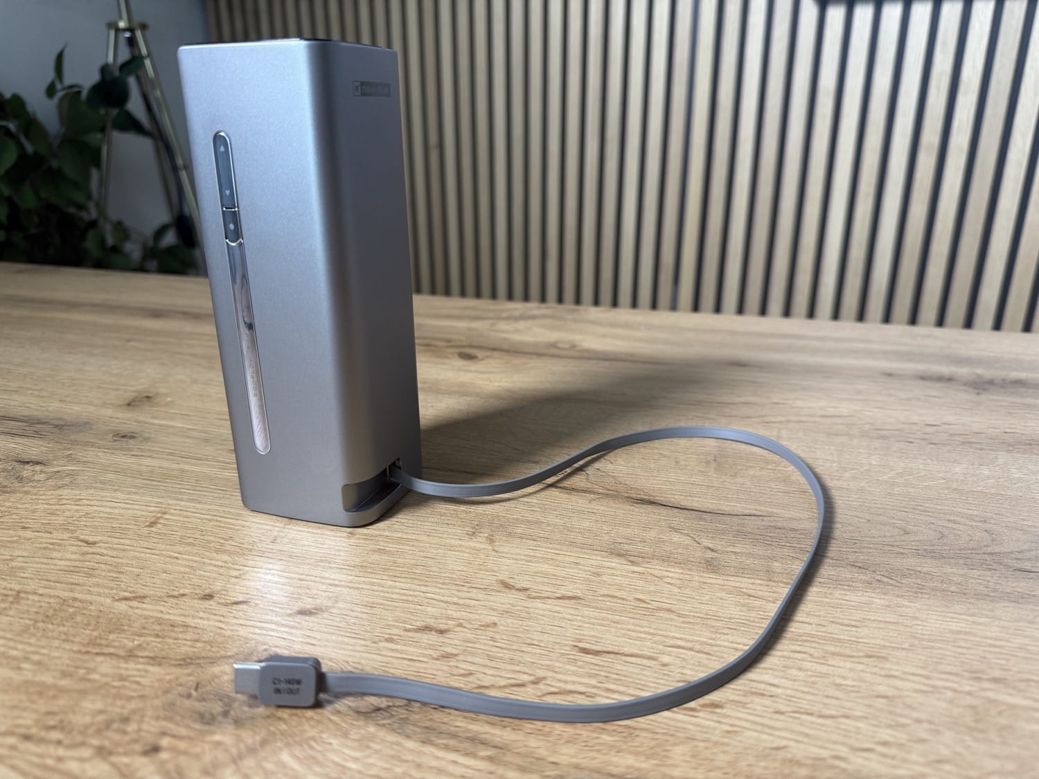 Um die Energie wider aus der Powerbank heraus zu bekommen, stehen neben dem integrierten Kabel drei weitere USB-C-Anschlüsse zur Verfügung. Der zweite Port liefert ebenfalls bis zu 140 Watt, Nummer drei und vier kommen jeweils auf 65 Watt. Einen USB-A-Port sucht man vergeblich.
