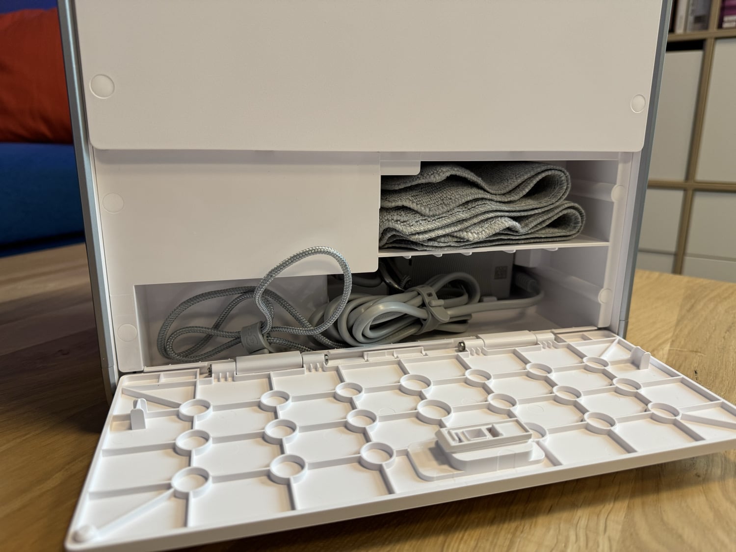 Der Lieferumfang ist auf den ersten Blick sehr überschaubar, da lediglich eine Station mit den Abmessungen 312 x 215 x 327 Millimeter geliefert wird. Und das ist auch der große Vorteil, denn in der Station ist alles verstaut, was man benötigt. Der Fensterputzroboter selbst, Reinigungslösung, Mikrofaserwischpads, ein Stromkabel und der Kabelwickler. Mit einem Griff könnt ihr die Station einfach vor jedes Fenster stellen und so zügig mit der Arbeit beginnen.