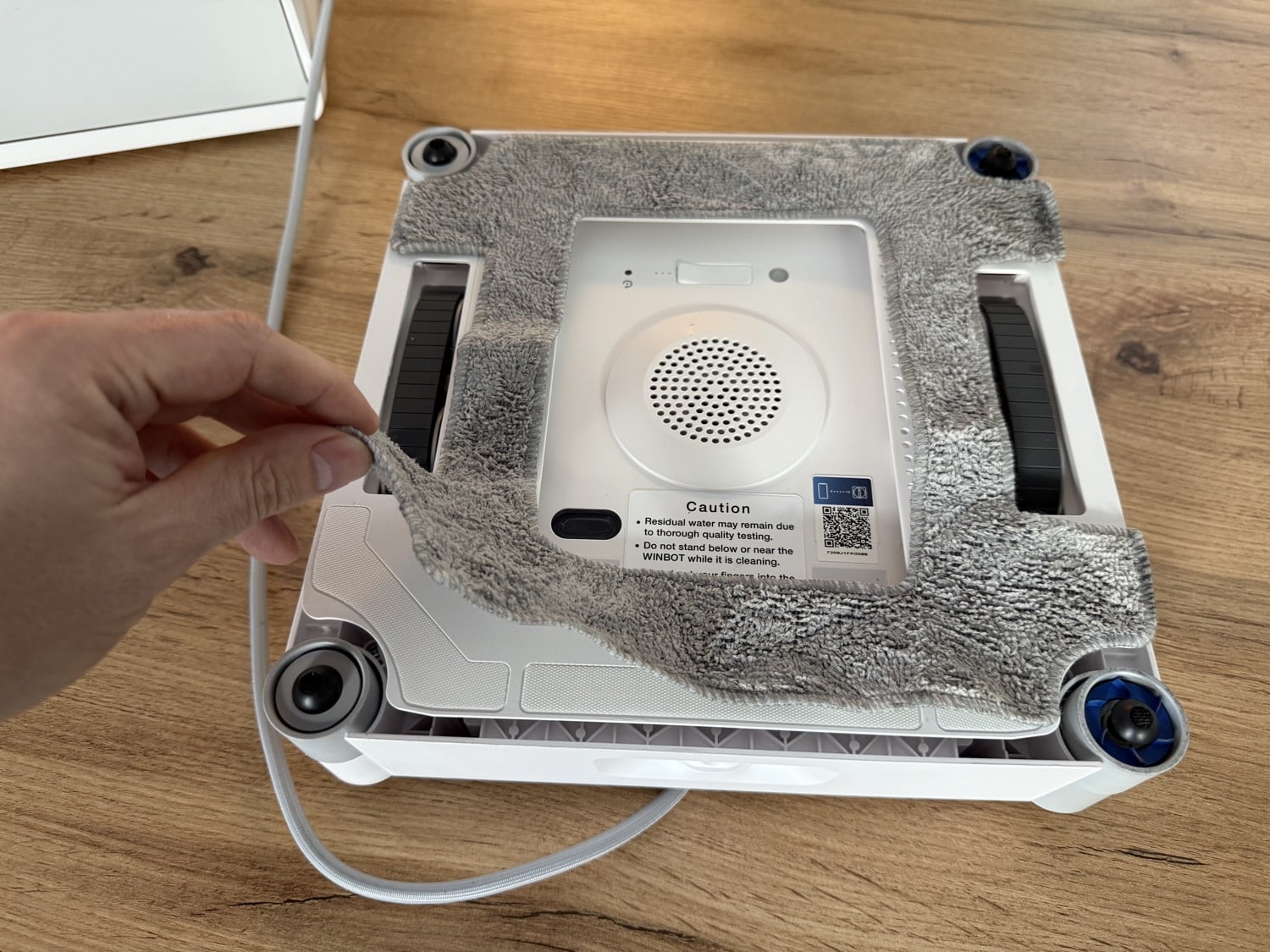 Anders als ein Saug- und Wischroboter arbeitet der Ecovacs WINBOT W2S Omni aber nicht komplett autonom. Man muss ihn zwischendurch manuell an die nächste Scheibe setzen und auch das Wischtusch muss per Hand gereinigt und angefeuchtet werden. Zudem empfehle ich den Einsatz eines Mikrofasertuchs, denn an der Stelle, an der der Roboter anhält und man ihn abnimmt, bleibt immer etwas Feuchtigkeit zurück.