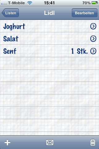 Wer sein iPhone eh immer dabei hat kann auf Stift und Papier verzichten. Für 0,79 Euro bekommt man die Einkaufsliste im App Store. Das ist doch viel billiger als jedes mal Papier zu verschwenden, oder?