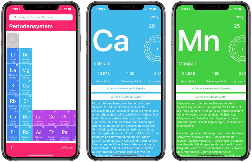 Elementium bietet Zugriff auf das Periodensystem. In den Details gibt es Infos zur Atommasse, Elektronegativität, Atomradius, Schmelz- und Siedepunkte, Elektronenkonfiguration und mehr. Natürlich gibt es hier auch eine ausführliche Beschreibung. Praktisch: Es gibt eine Suchfunktion. Hier könnt ihr Namen, Nummern oder Abkürzungen eintippen und so schnell das richtige Element abrufen.