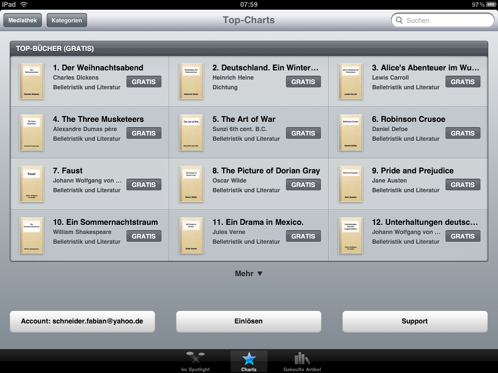 Wirklich berauschend ist die Qualität der angebotenen Titel momentan allerdings noch nicht, denn es gibt weiterhin nur sehr wenige deutsche Titel. Und alles das, was verfügbar ist, ist ohnehin gratis und stammt aus dem Projekt Guttenberg – es ist also nichts besonderes.