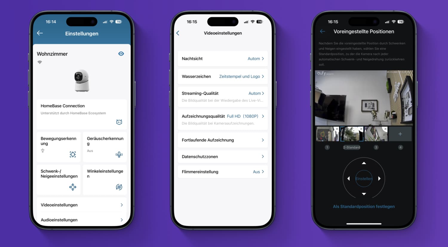 Es gibt aber auch einen Privatsphäremodus. In dem werden nicht nur Kamera und Mikrofon deaktiviert, die Eufy Indoor Cam C210 dreht sich auch in einer zuvor definierte Position – also beispielsweise in Richtung Wand. Dieser Modus lässt sich entweder per Knopfdruck in der App aktivieren oder auf Wunsch auch automatisch per Zeitplan oder Geofencing.